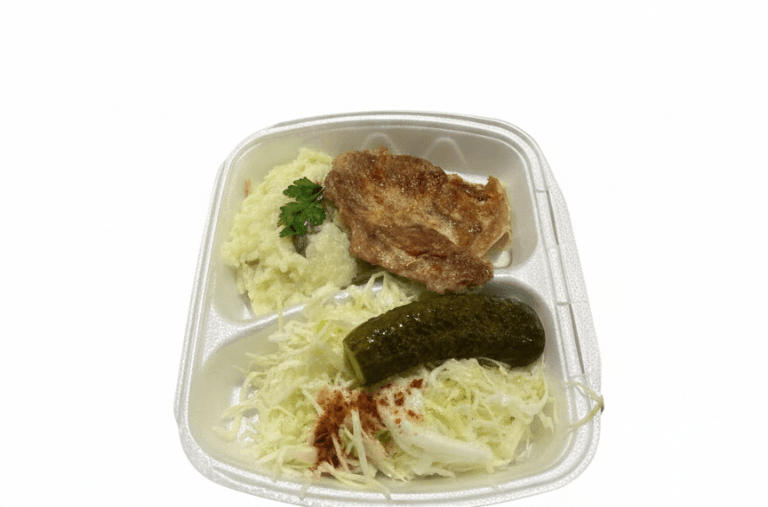 Pulpa de pasăre, orez, morcov, ceapă, ardei gras, roșii, usturoi, ulei, sare, piper, condimente (cimbru, foi de dafin), salată de varză (varză, morcov, ulei, oțet), crudități (castraveți, roșii etc.), murături (castraveți murati).Declarație nutrițională în medie per 100g