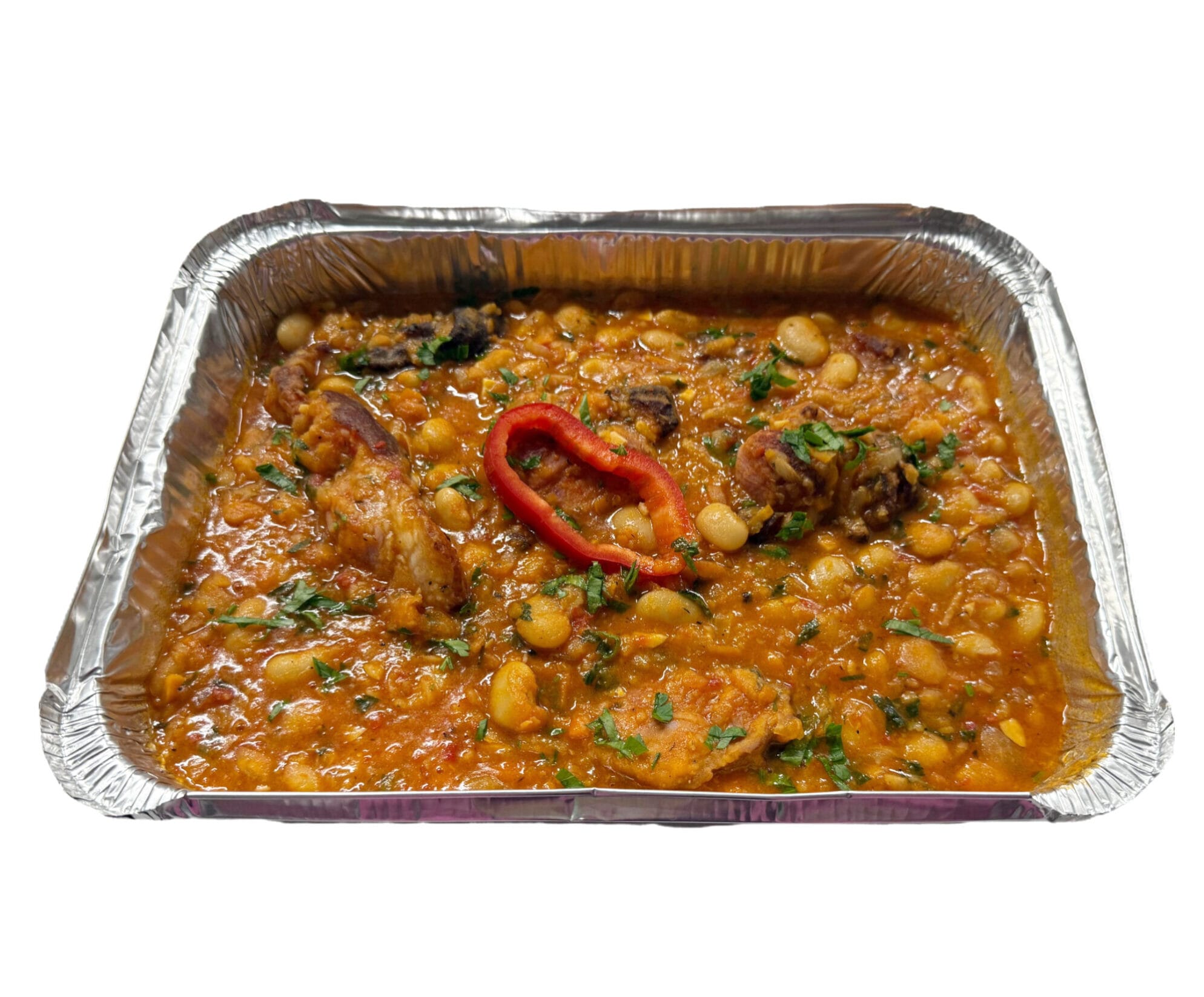 fasole boabe, ciolan de porc afumat 400g, ceapă, morcov, telina, roșii, usturoi, foi de dafin, ulei, sare, piper, verdeață.Declarație nutrițională în medie per 100g