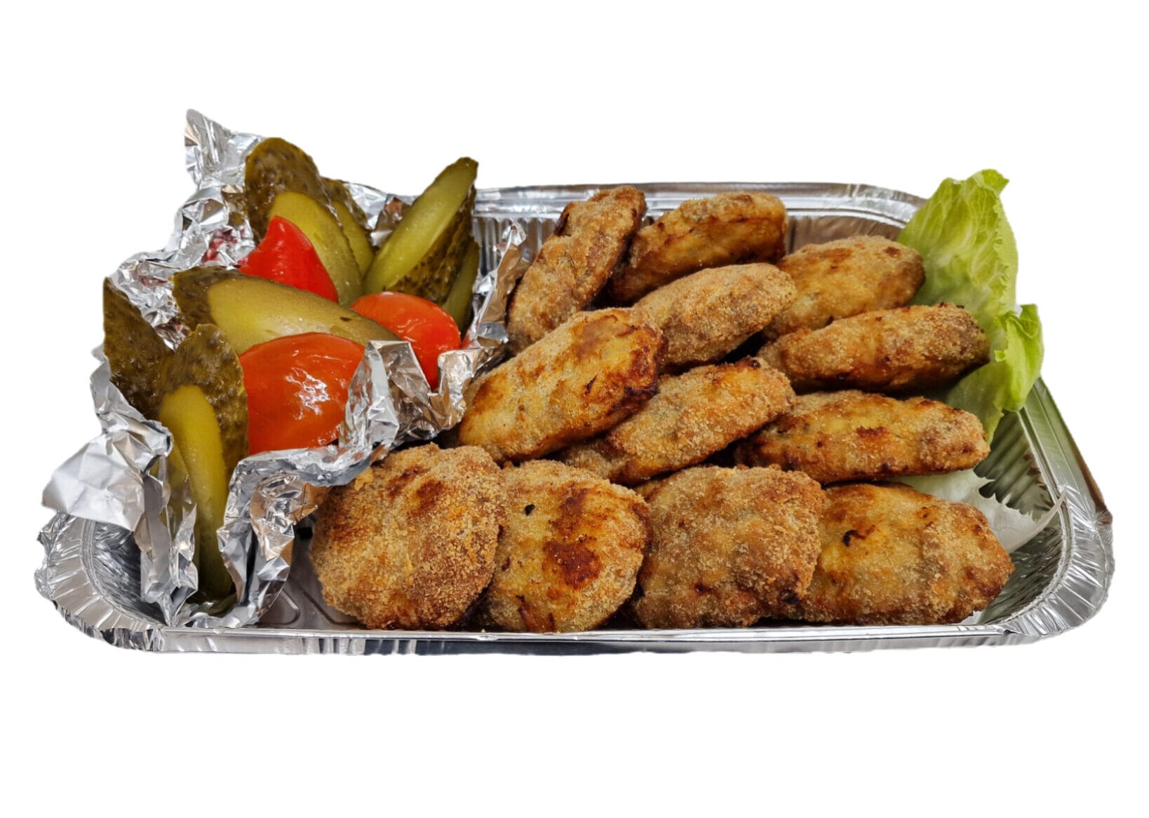 Carne tocată mixtă (pasăre, porc), pâine/făină, ou, ceapă, usturoi, verdeață, condimente, ulei pentru prăjit, pesmet. Acrituri: castravete murat, gogoșar murat, varză murată, condimente de murături (sare, oțet, acid citric, foi de dafin, boabe de piper).Declarație nutrițională în medie per 100g